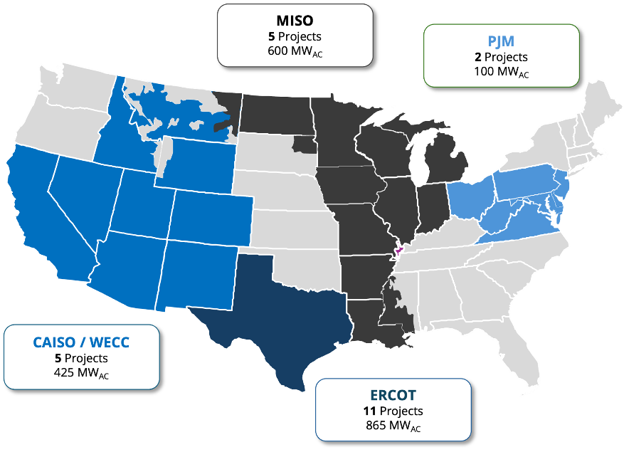 Our portfolio of 23 BESS Development Projects includes approximately 2.0 GW of alternating current (GWAC) power capacity across various regions served by Independent System Operators (ISOs) such as ERCOT, WECC, PJM, and MISO. These regions have been selected strategically based on favorable market conditions, grid infrastructure, and regulatory environments conducive to renewable energy integration.